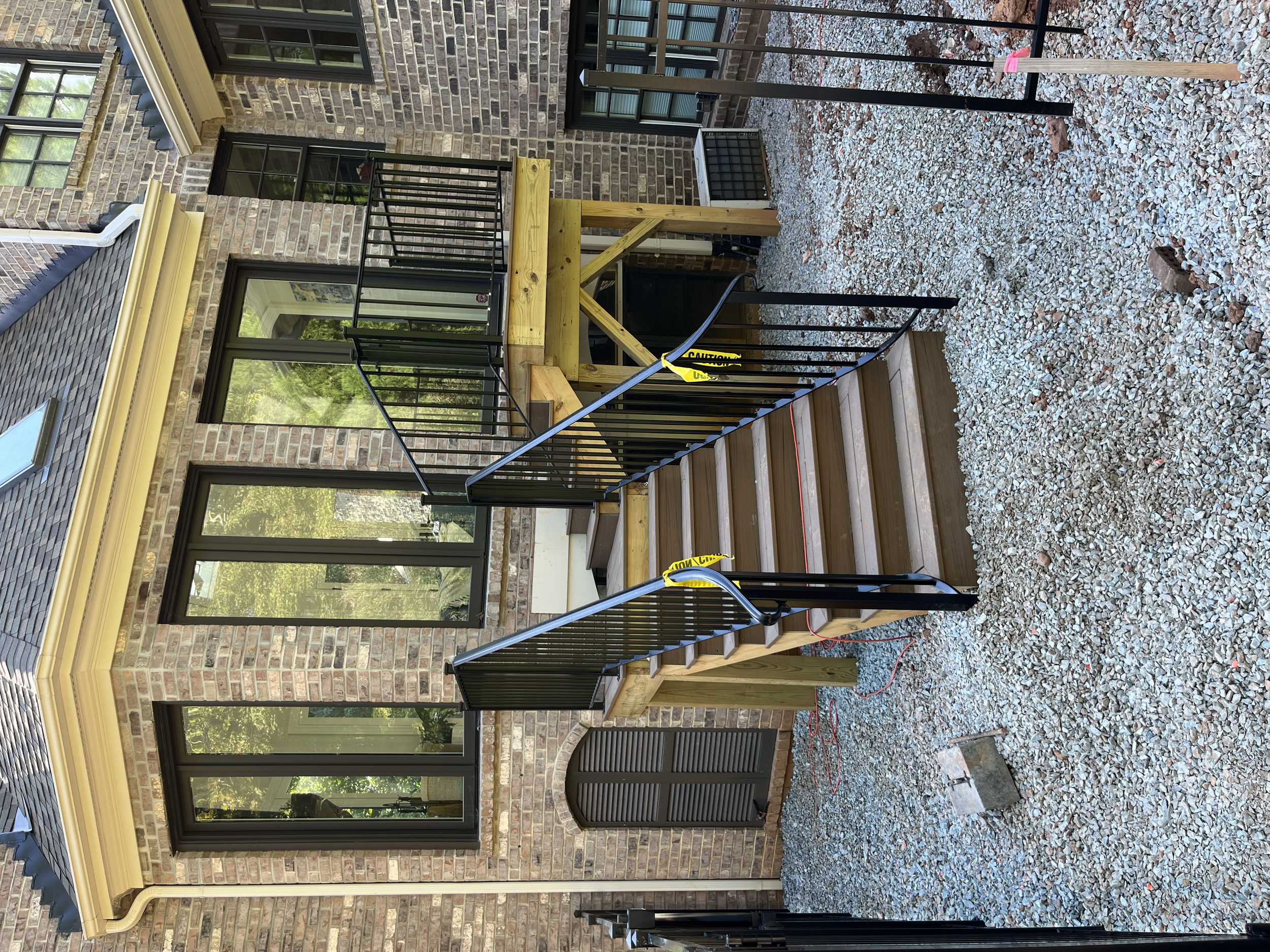 The side staircase was built completely new so we could expand the upper landing and shorten the step height. A landing/platform was added midway in order to turn left and continue the stairs down to the new dog run. Trex Transcend decking was installed in a picture frame style, while “Oversized” wrought iron railings were installed to match the existing rear staircase.